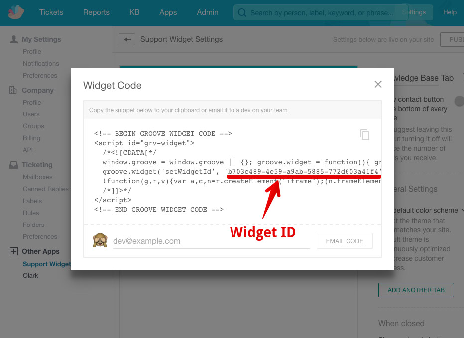 Your widget settings can be accessed by logging into your Groove account, clicking Apps at the top of the page, and then Support Widget > Settings.