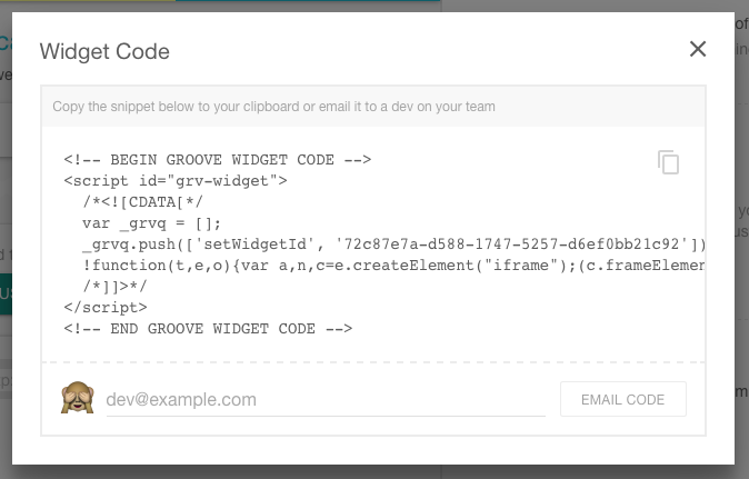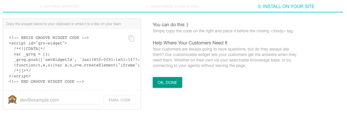 On the final step, you will be given a snippet of code and the option to either copy it or email it to a developer on your team.