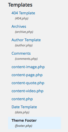 In the editor, locate the footer.php file in the list of files on the right side of the theme editor.