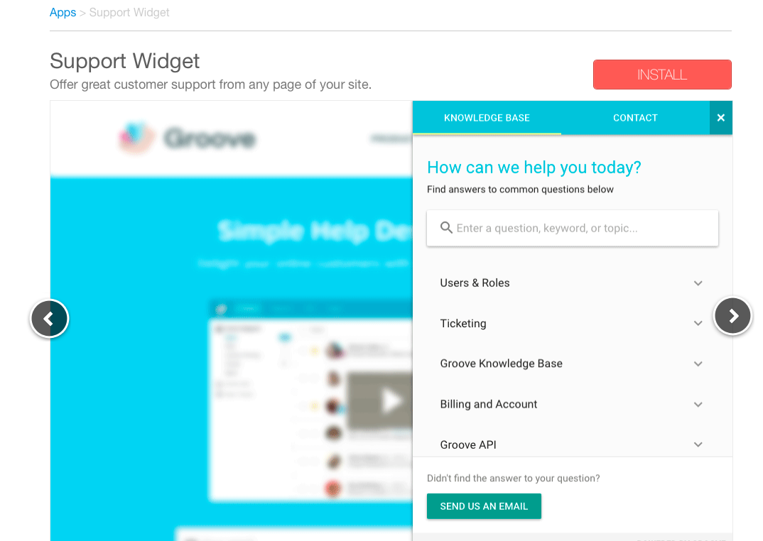 To install the widget, log in to your Groove account and click Apps at the top of the page. Then locate the Support Widget app and click Install on the widget page.