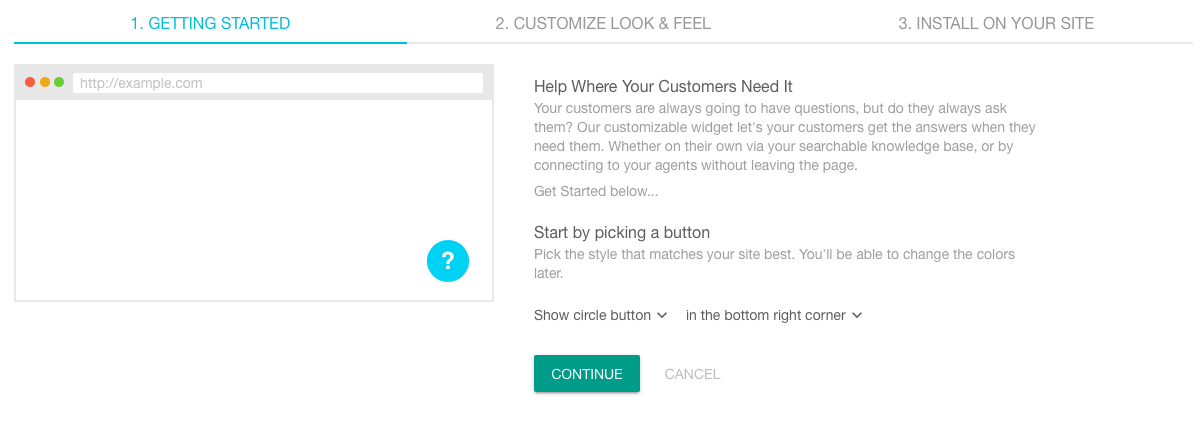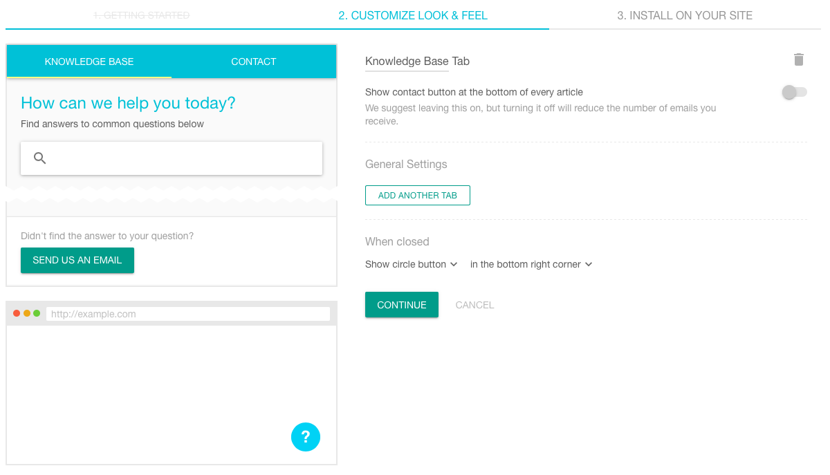 Note: The KB tab in your widget will not appear when the widget is installed on your knowledge base, since your articles are already visible on that page.