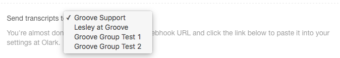 In your Olark app settings in Groove, you can select the mailbox you want your chat transcripts to send to using the dropdown menu in your Groove settings.