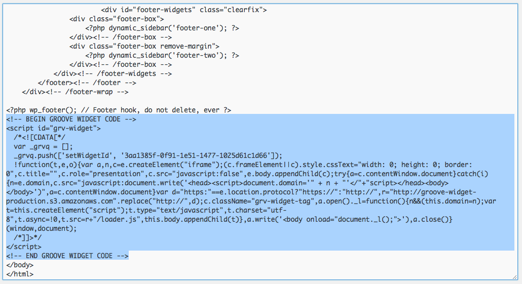 In this file, paste the code snippet for your support widget just above the closing </body> tag at the bottom of the file.