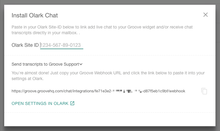 A settings modal will appear and you'll need to take the following steps to connect your Olark account to Groove.