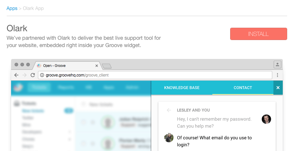 In the Apps section of your Groove account, select the Olark integration and then click Install on the app page.