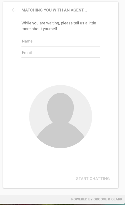 After a chat is initiated, the customer will be prompted to enter a name and email address while being matched with an available agent.