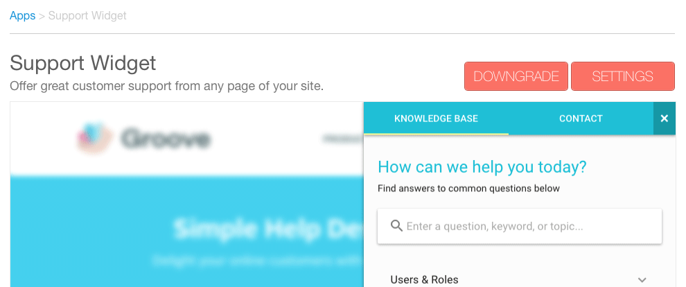 The Groove customer support widget is a small tab that can be easily installed on your site, giving your customers a simple way to search your knowledge base and/or contact you.