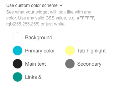 If you select "use custom color scheme" from the dropdown selection, you can customize the colors of your widget to match your own branding.