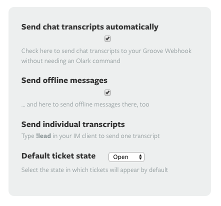 In your Groove integration settings in Olark, you can opt to send all transcripts and offline messages to your Groove account.